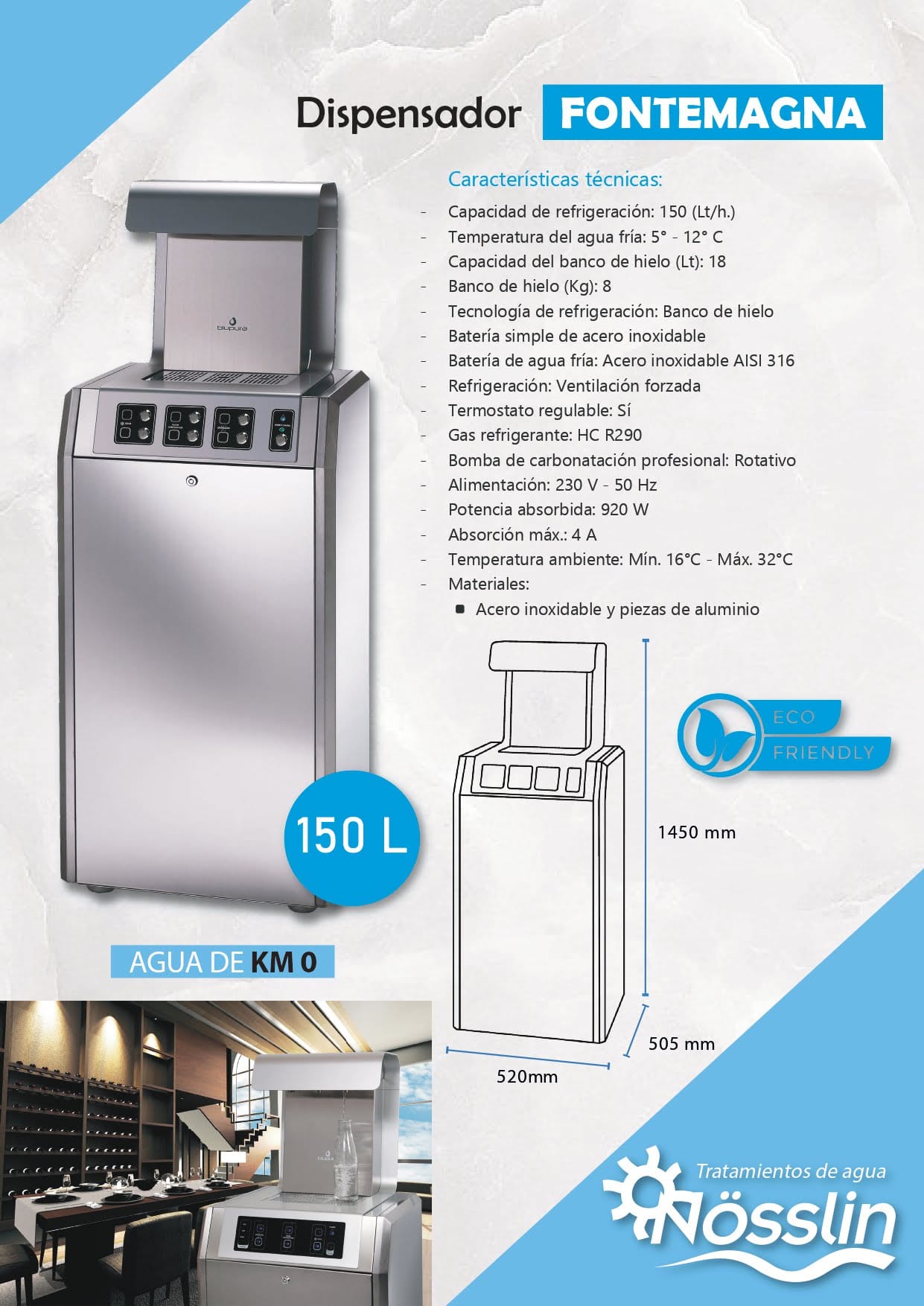 Fontemagna IT es un dispensador de agua de alto rendimiento diseñado para satisfacer las necesidades de espacios comerciales y públicos con gran afluencia. Este modelo combina tecnología avanzada con un diseño moderno, garantizando un suministro continuo de agua fría y ambiental.