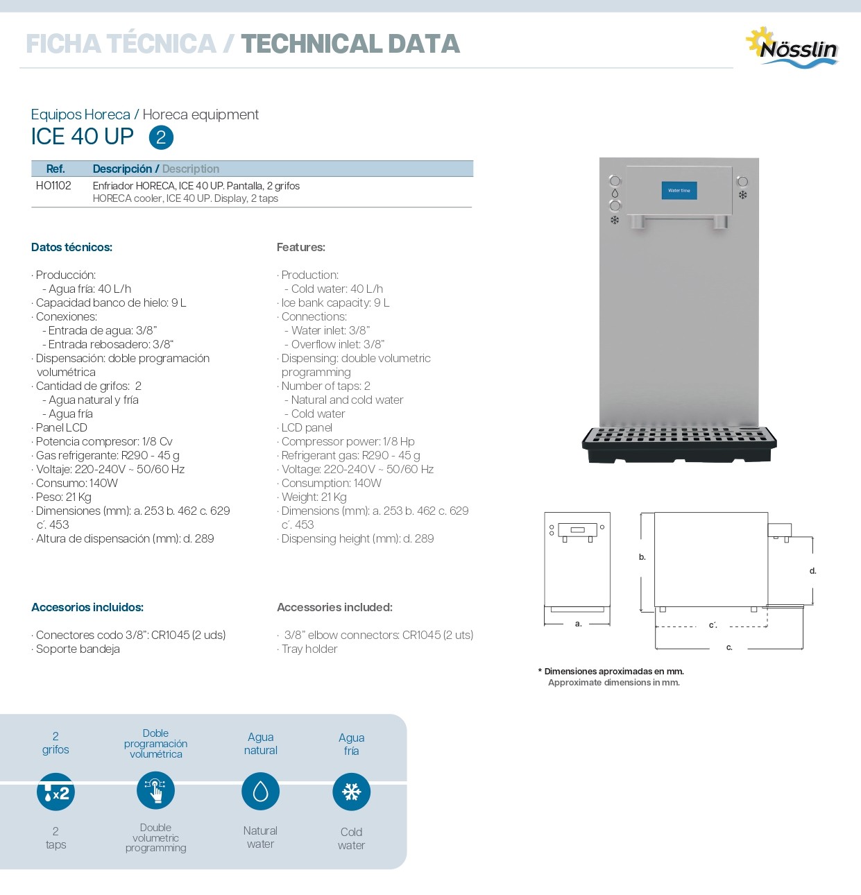 La ICE 40 UP es una fuente de agua de sobremesa profesional diseñada para establecimientos Horeca de tamaño medio, que ofrece agua fría, natural o con gas al instante con solo pulsar un botón.